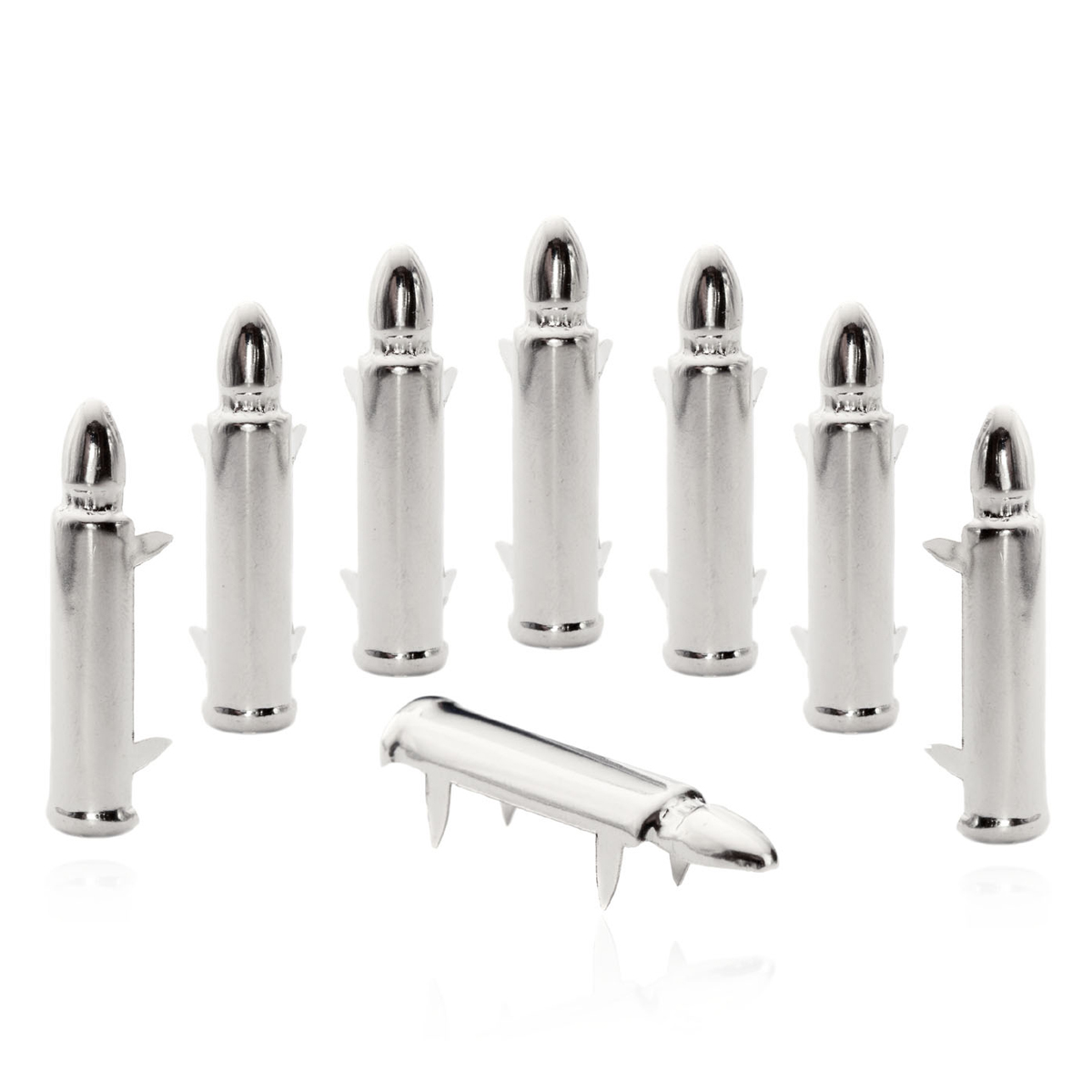 Bei diesen Angebot handelt es sich um Bullet Nieten / Patronen Nieten Egal ob sie diese Bullet Ziernieten für ihre Kleidung , Nieten für Lederwaren ,Nieten für Schuhe, oder Nieten für ihre alte Jeans verwenden mit diesen schönen Patronen Nieten bringen sie ihren Accessoires den besonderen style. Wählen sie einfach die Menge der Bullet Nieten in den Optionen aus, und profitieren sie von unseren Rabatten.Dies Bullet Krallennieten haben ein 4 Pin Karallenverschluss sind aus Stahlblech gefertigt und vernickelt und haben eine schöne silberne Hochglanz Optik.